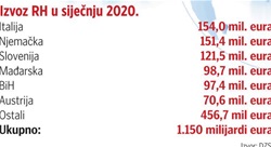 Vrijednost hrvatskoga robnog izvoza u prva dva mjeseca ove godine iznosila je 18,1 milijardu kuna, što je za 5,1 posto više nego u istom razdoblju lani, dok je uvoz rastao za 4 posto, na 29,7 milijardi kuna, pokazuju prvi podaci Državnog zavoda za statistiku (DZS) objavljeni u petak.Vanjskotrgovinski deficit tako je u prva dva mjeseca iznosio 11,6 milijardi kuna, odnosno bio je za 264,3 milijuna kuna veći nego u prva dva mjeseca 2019. godine. Pokrivenost uvoza izvozom istovremeno je porasla sa 60,4... pročitajte više