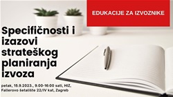 Dana 13. listopada 2023.g. HIZ d.o.o. za poslovne usluge organizira radionicu na temu: SPECIFIČNOSTI I IZAZOVI STRATEŠKOG PLANIRANJA IZVOZA, od 09:00 do 16:00 sati, u prostorijama Hrvatskih izvoznika, Fallerovo šetalište 22, Mini neboder, 4. kat, u Zagrebu. Izvozna orijentiranost hrvatskog gospodarstva preduvjet je održivog rasta i razvoja. Hrvatska je malo, ali otvoreno, izvozno orijentirano tržište. Usmjerenost na izvozno orijentirane proizvodne i razvojne aktivnosti i djelatnosti gospodarstva... pročitajte više